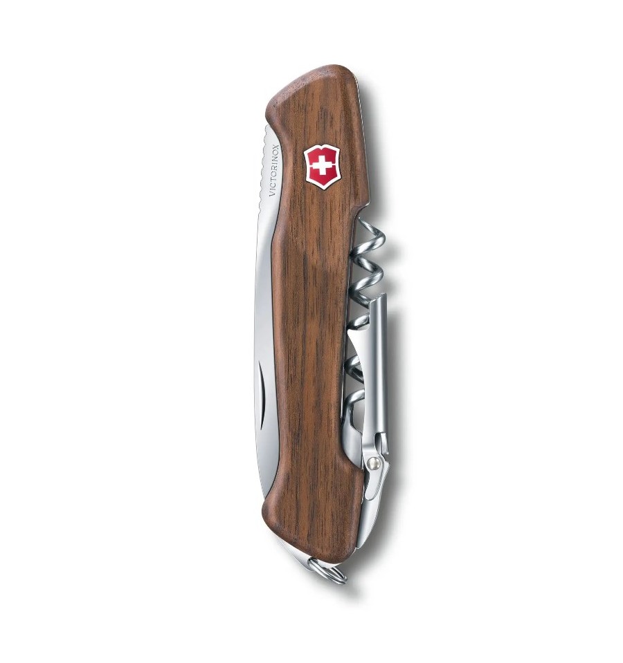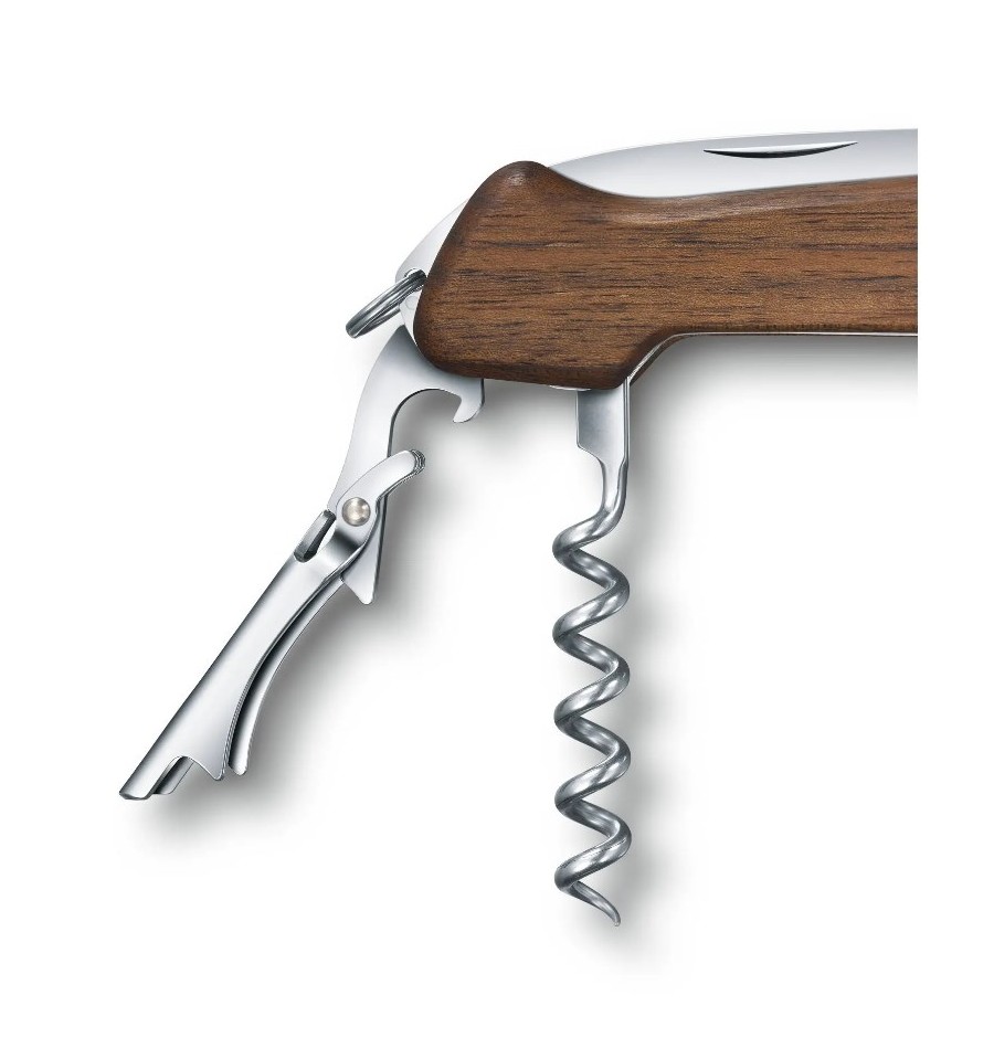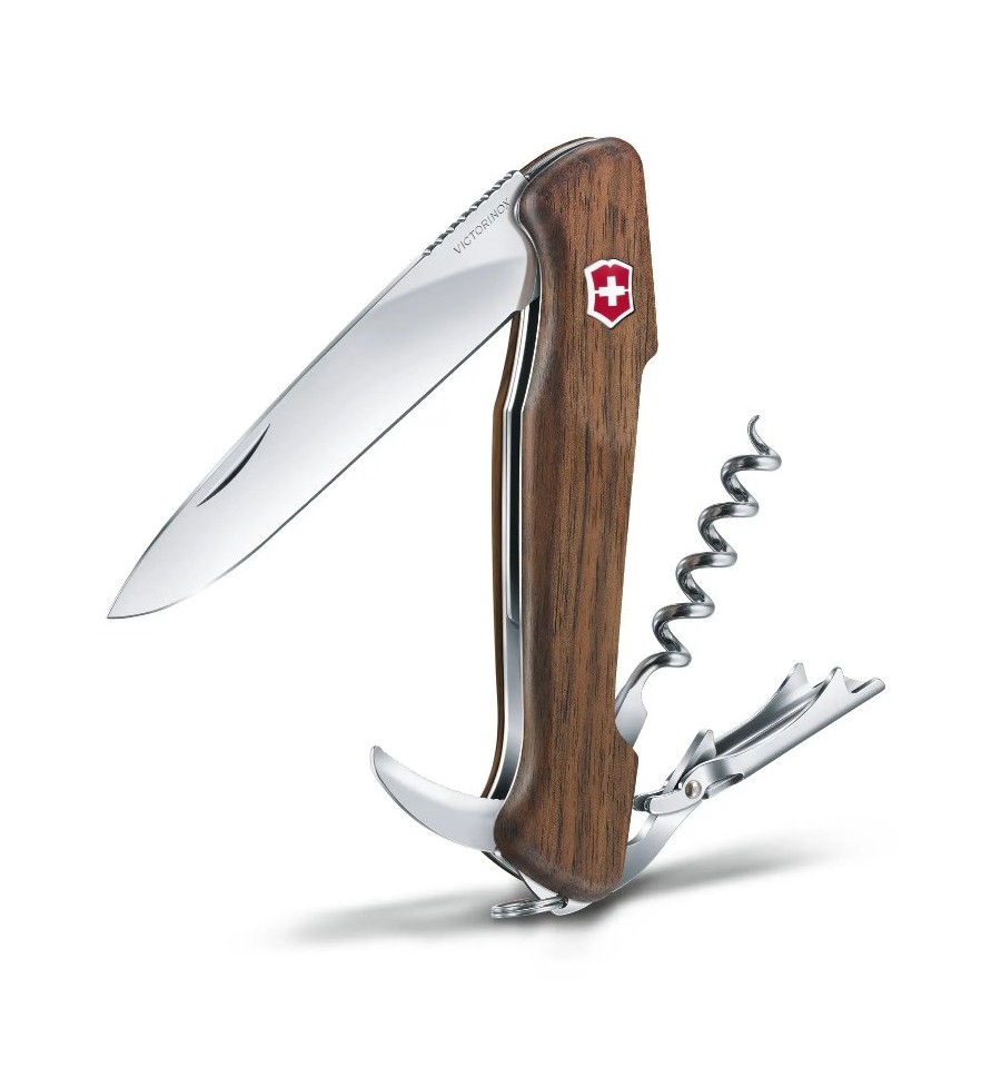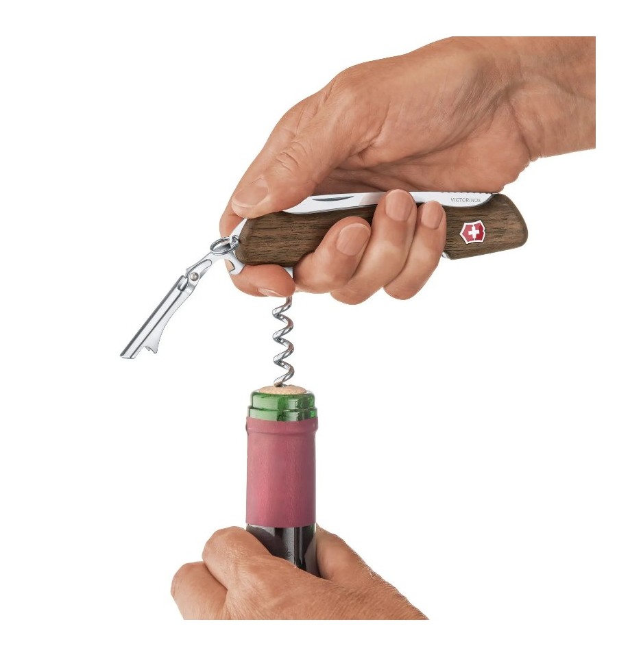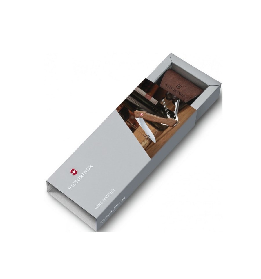 Victorinox Wine Master are manerul din lemn de nuc si se livreaza cu husa de piele.