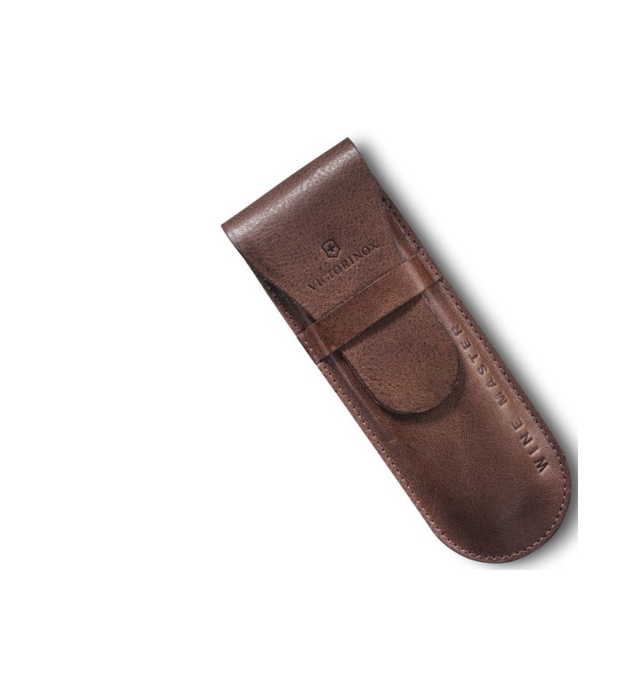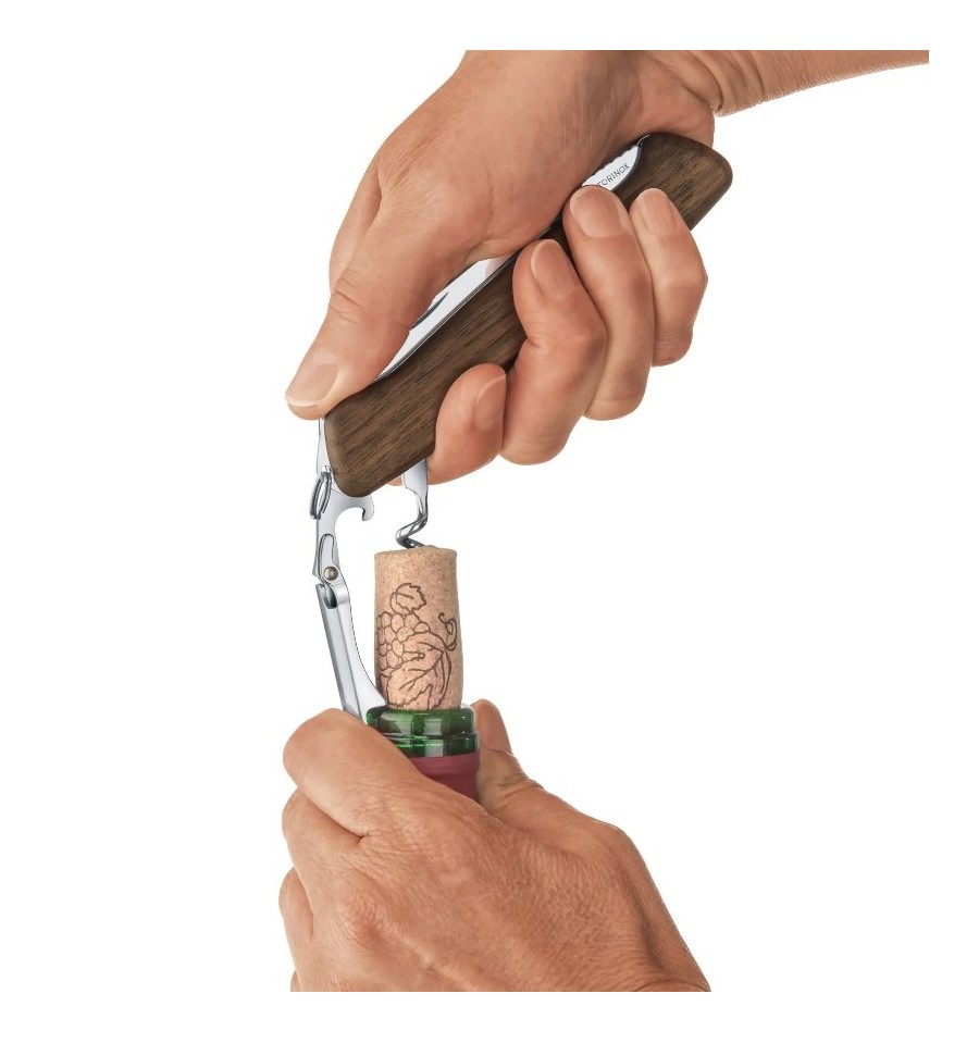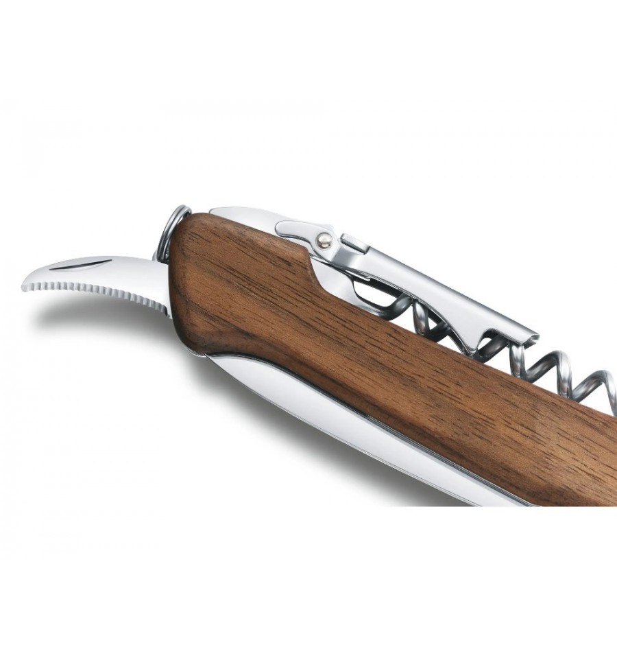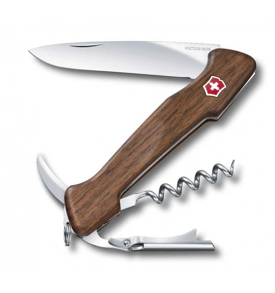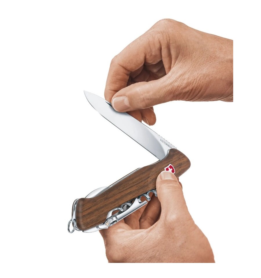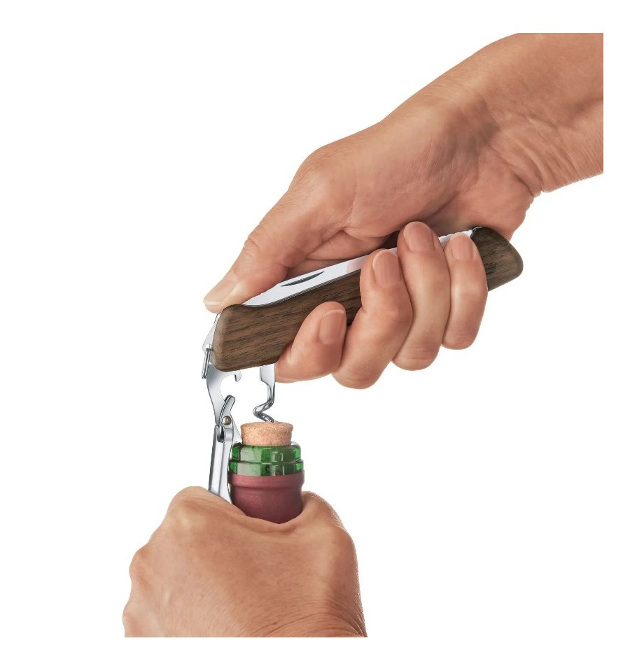 Victorinox Wine Master are manerul din lemn de nuc si se livreaza cu husa de piele.