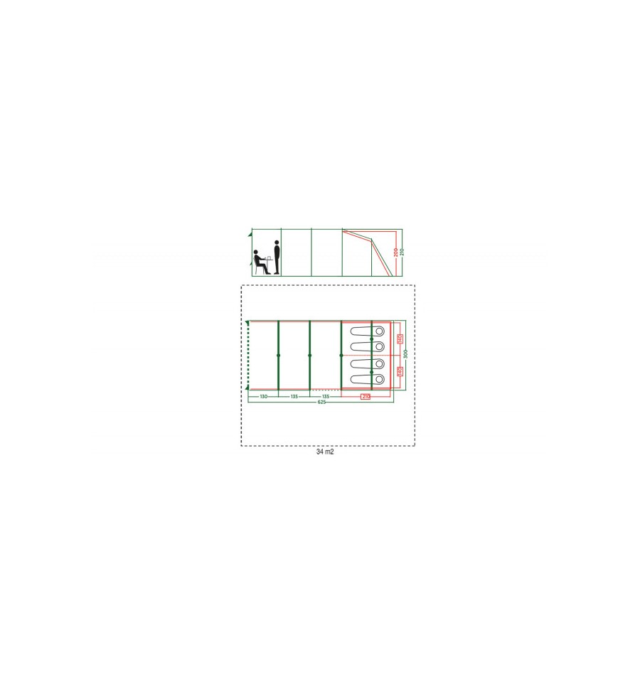 Zona de living este suficient de spatioasa pentru o masa cu scaune si deasemenea dispune de ferestre mari din PVC, oferind echilibrul perfect de lumina si intimitate, pentru accesul facil acest cort are multiple intrari foarte inalte. Dormitoarele sunt XXL, avand mai mult spatiu decat corturile standard.