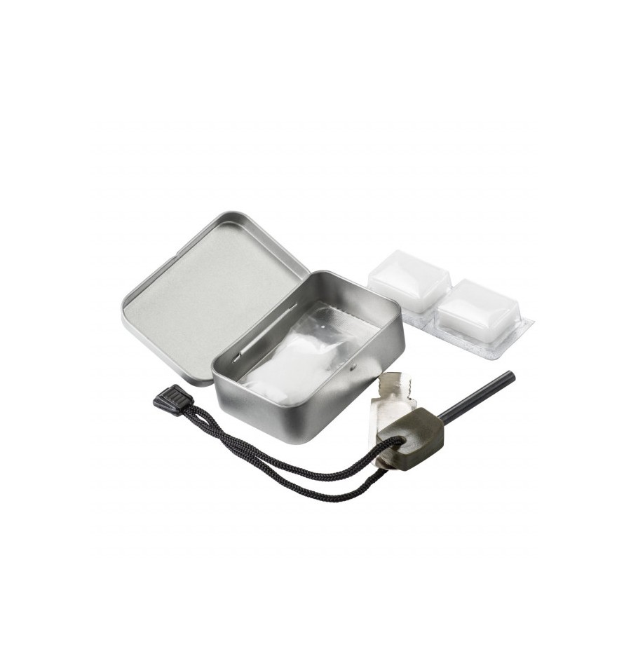 Setul MK2 Firestarter este compus dintr-o cutie metalica, amnar, 2 tablete impregnate cu combustibil si vata de bumbac, tot ce este necesar pentru a aprinde focul.