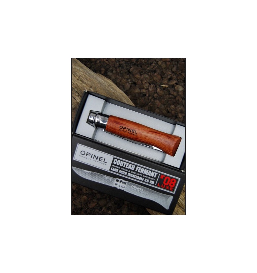 Manerul cutitului Opinel Nr. 8 inox lustruit lux este fabricat din lemn bubinga si este lacuit.