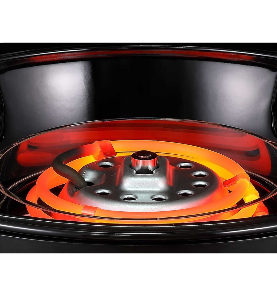 • Echipat cu suport pentru vase de gatit, grila de gratar si capac cu termometru integrat
