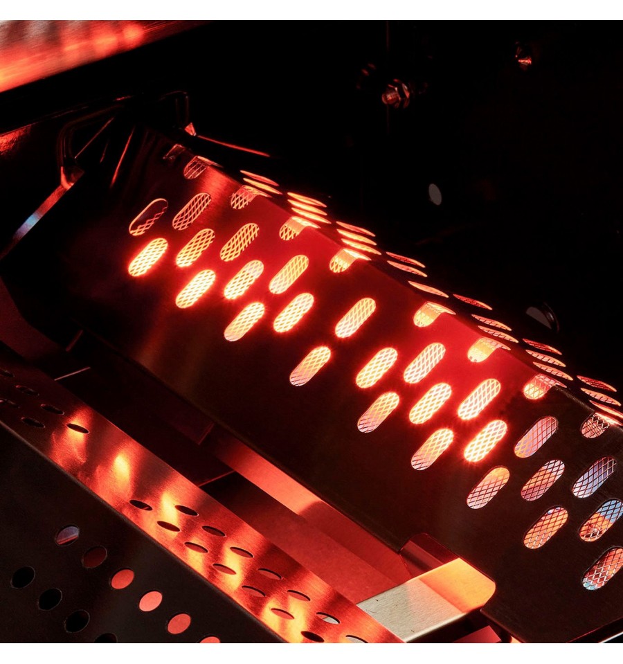 Structura estetica si rezistenta din otel: acest grill de gradina perfect echipat va garanteaza succesul procesului de pregatire a alimentelor la gratar, nelasand deoparte nici garniturile, care se pot gati concomitent pe suprafata de gatire din lateral. Datorita arzatorului cu infrarosu incorporat, pregatirea alimentelor suculente devine o optiune viabila. Prin fereastra de acces vizual in interior, puteti urmari in permanenta procesul de gatire.