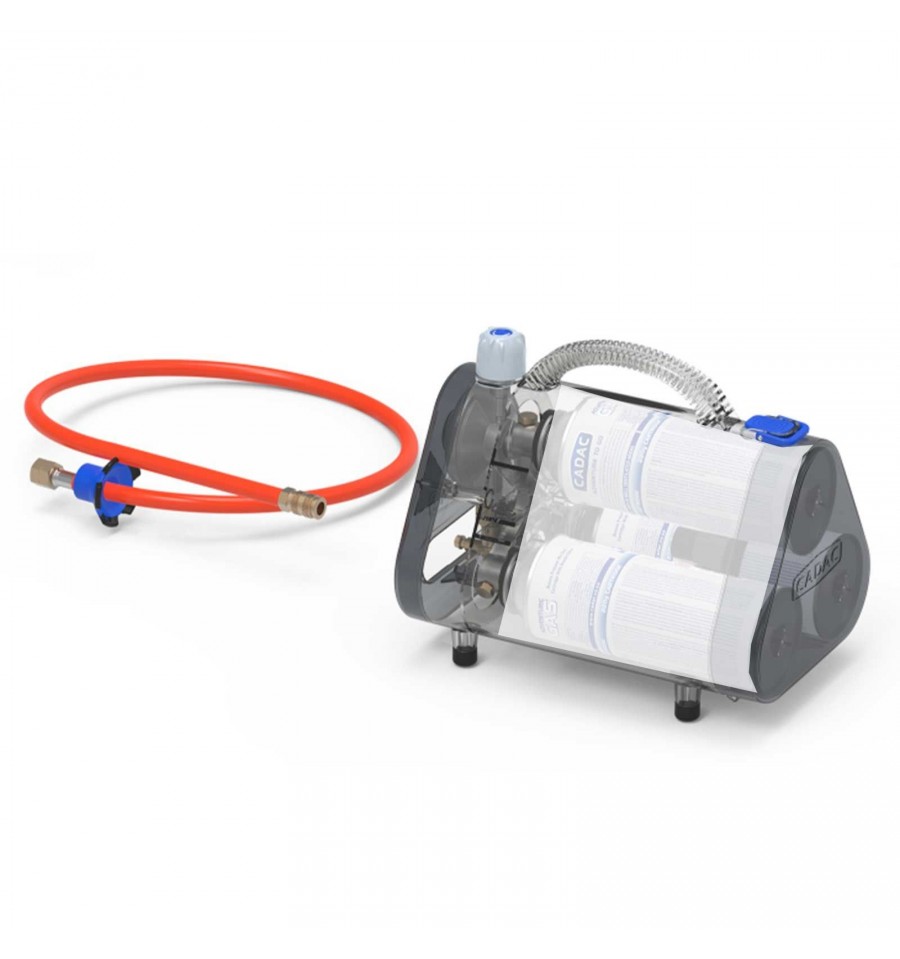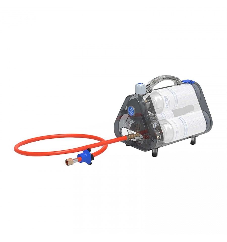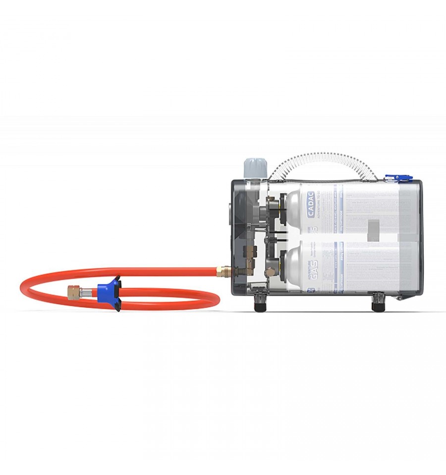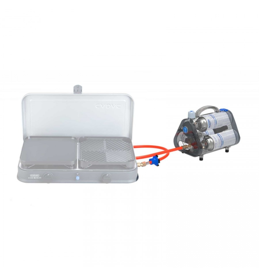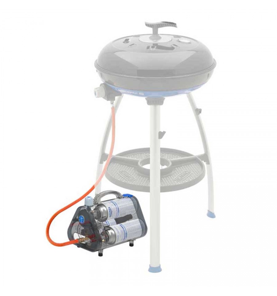Furtunul de gaz al kitului regulatorului de gaz poate fi (de)conectat cu usurinta datorita cuplajului cu eliberare rapida integrat. In acest fel, puteti (de)conecta furtunul de gaz cu un singur „clic”. Cele trei cartuse se cupleaza in suport. Debitul de gaz este dozat de regulatorul principal.