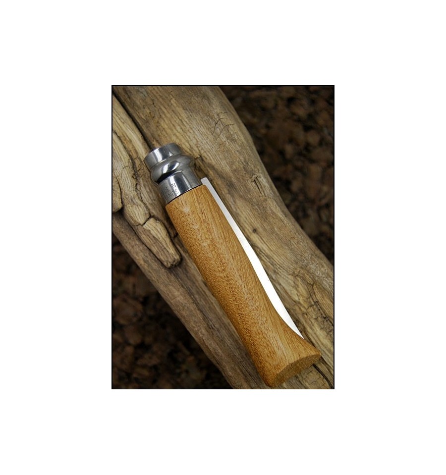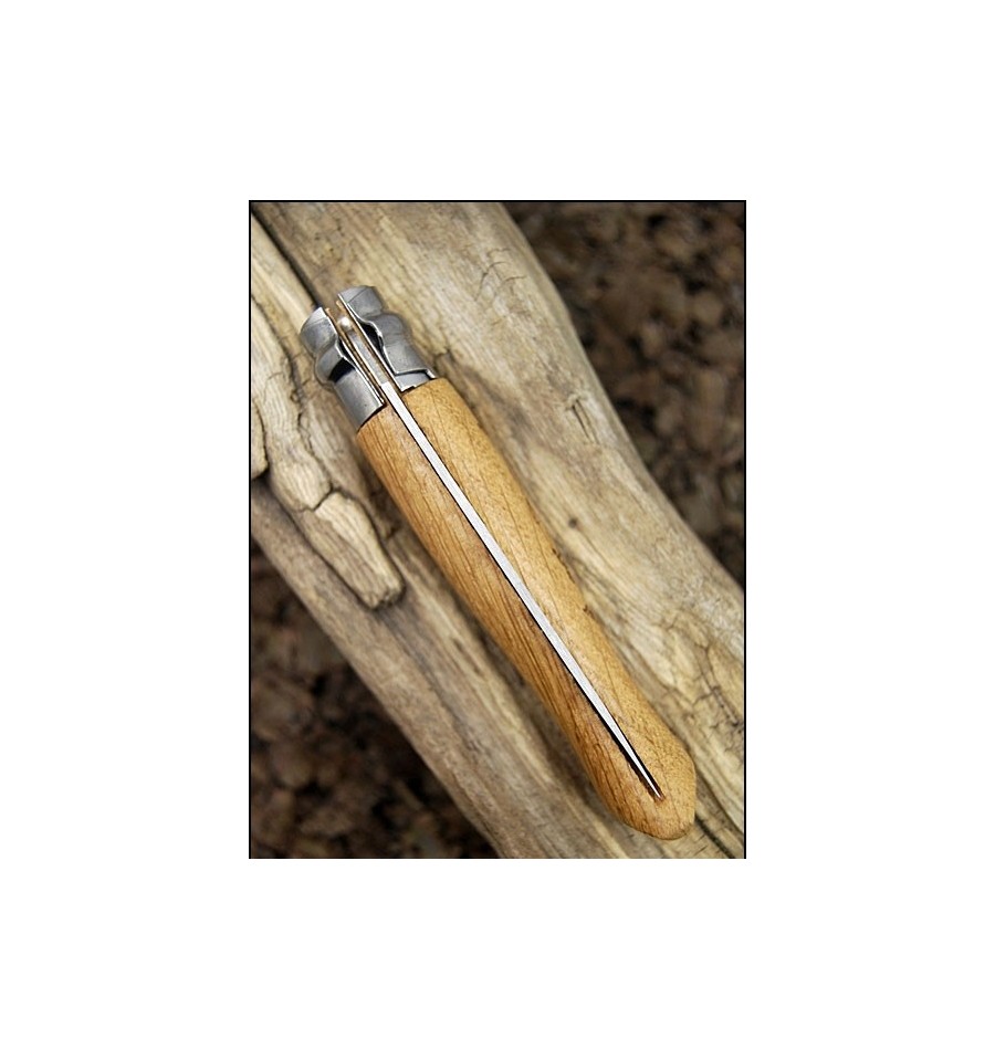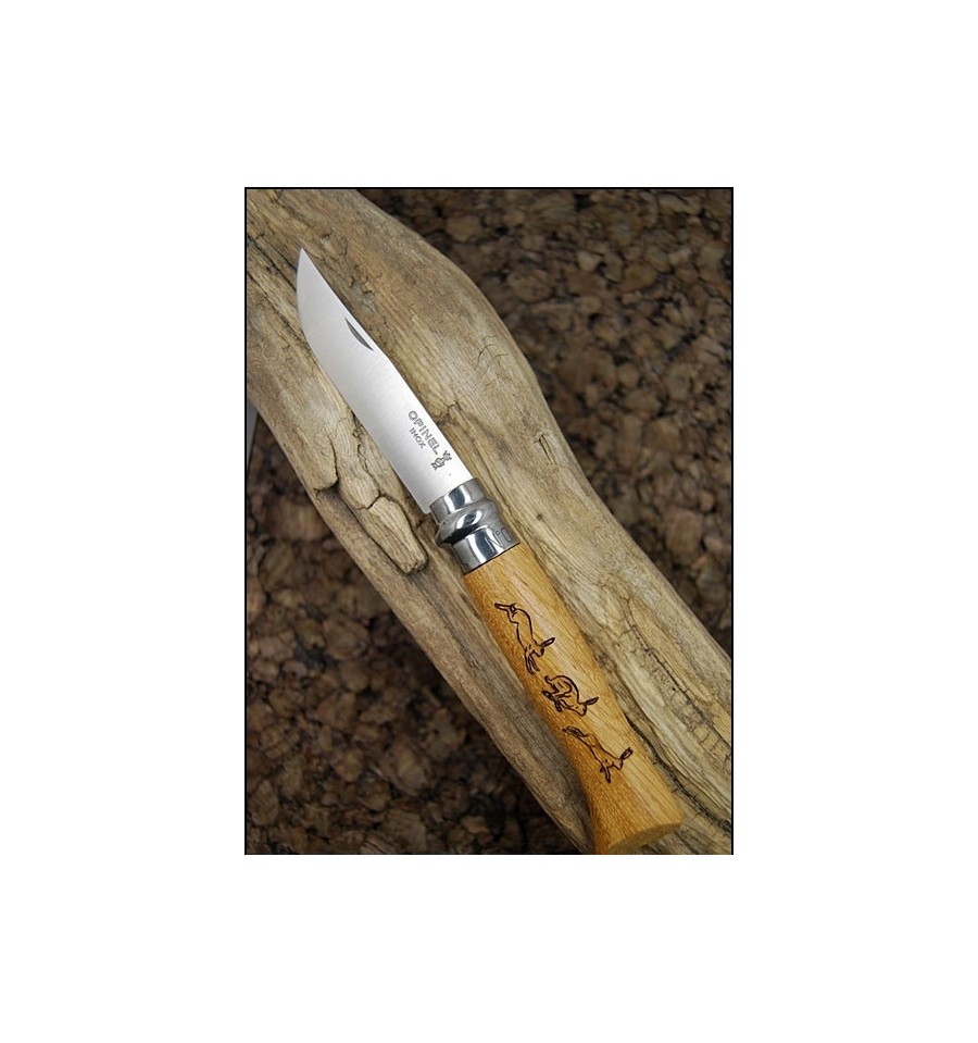 Cutit Opinel nr 8, lama inoxidabila, maner din stejar gravat cu iepuri salbatici.