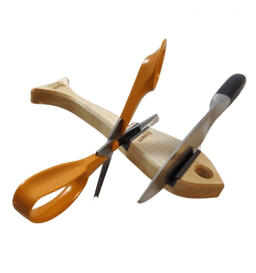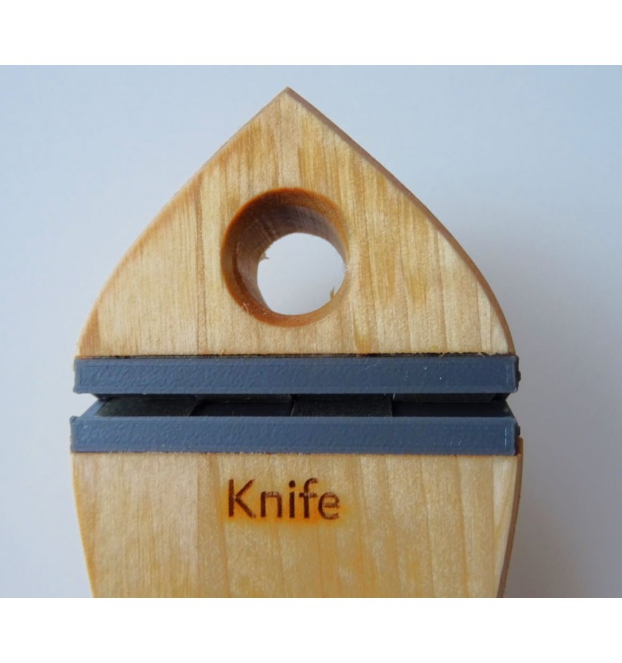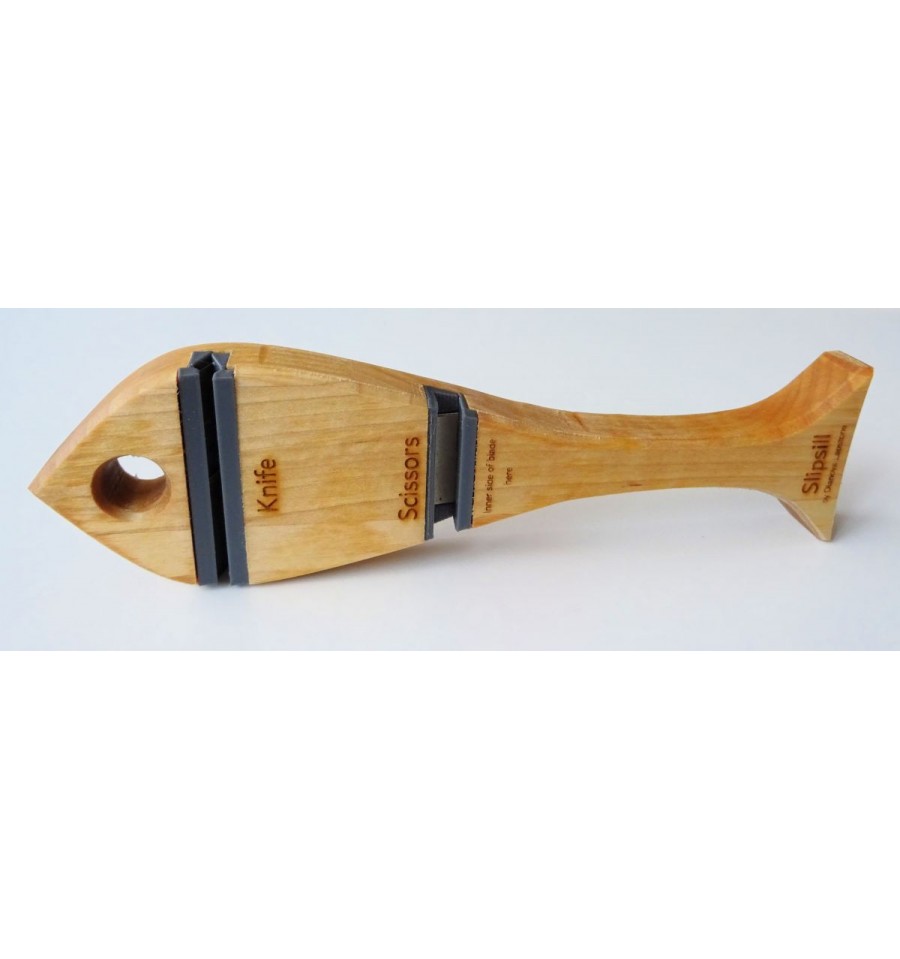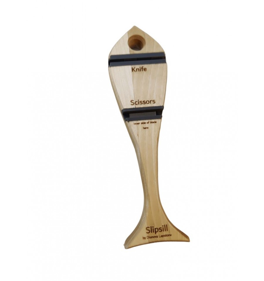 Dianova Lapstone Slipsill este un ascutitor diamantat cu doua spatii separate pentru ascutit cutite si foarfeci, pe suport din lemn in forma de peste.