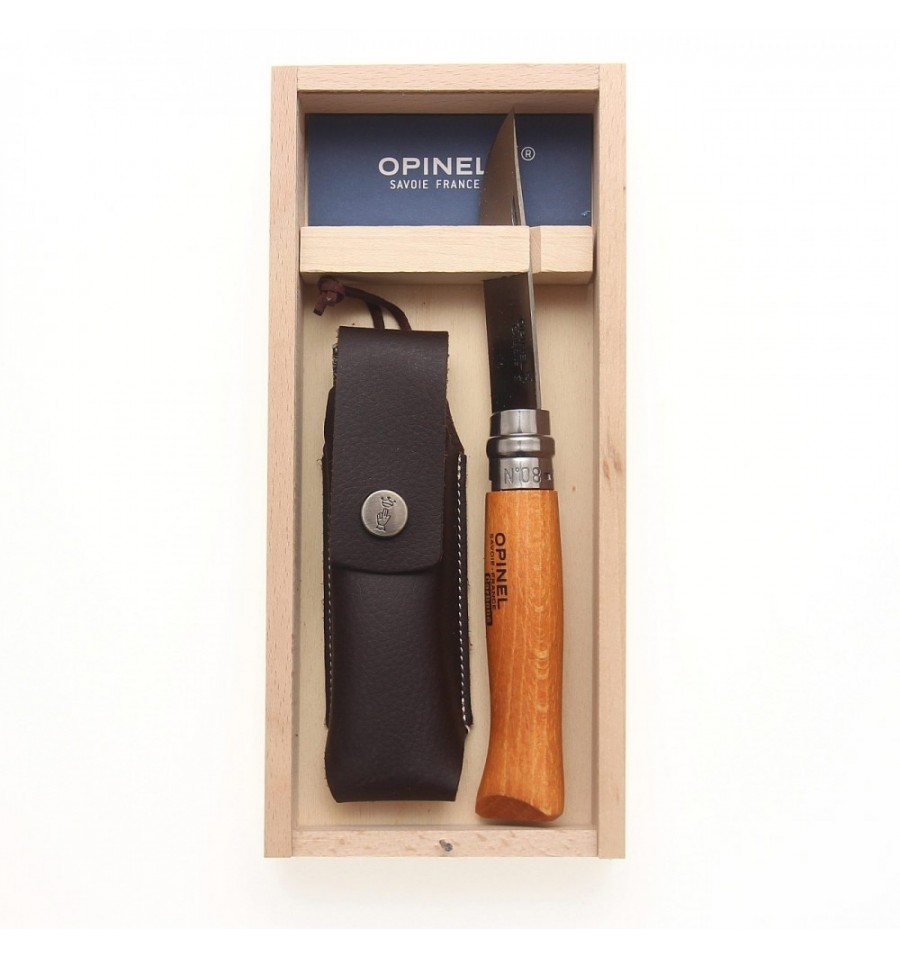 Set Opinel alcatuit dintr-un cutit Opinel Nr. 8 Carbon, cutie de lemn si teaca de piele pentru cutit.