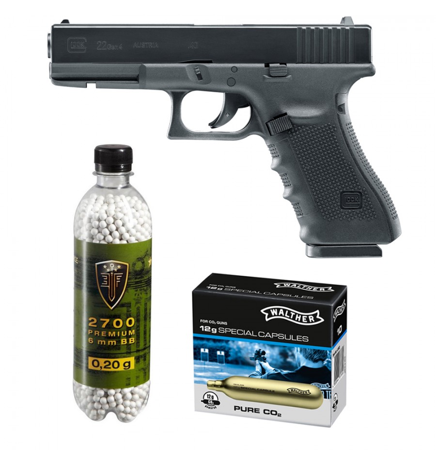 Set pistol airsoft 2 jouli + 10 capsule CO2 + flacon 2700 buc bile 0.20 g, Umarex Glock 22 Gen4, 6 mm