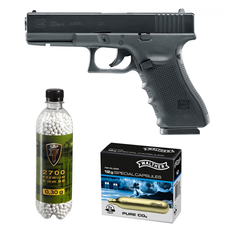 Set pistol airsoft 2 jouli + 10 capsule CO2 + flacon 2700 buc bile 0.30 g, Umarex Glock 22 Gen4, 6 mm