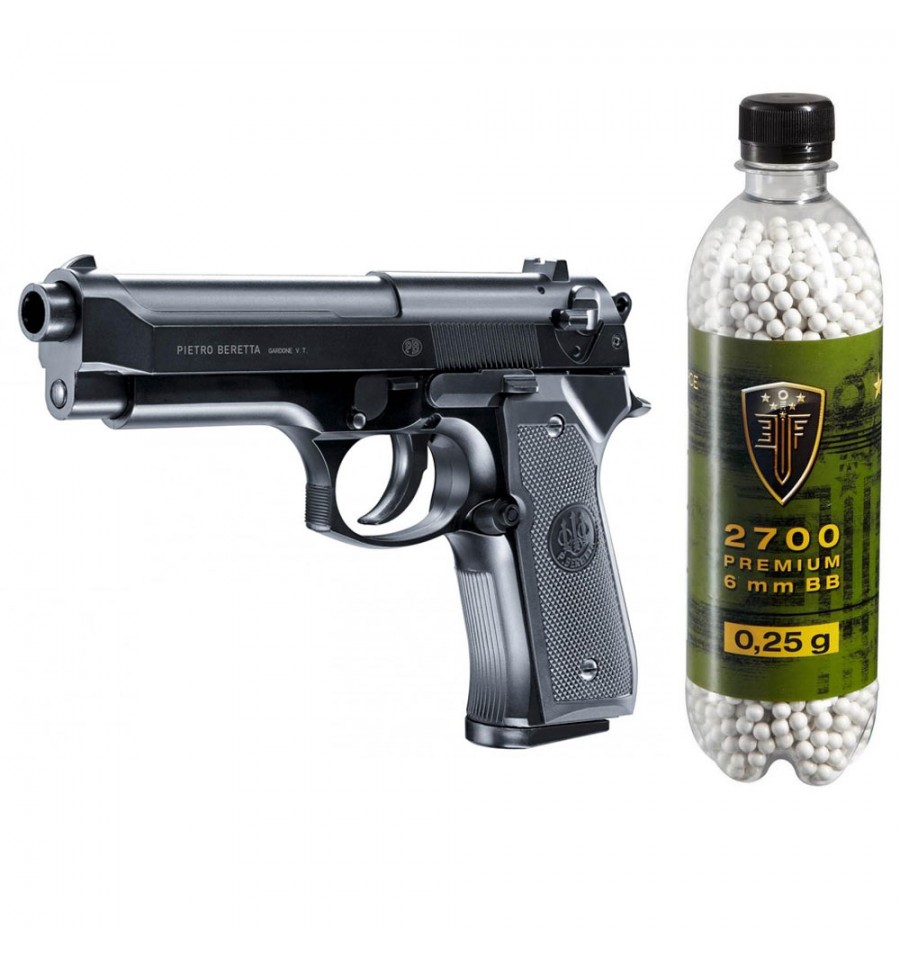 Set pistol airsoft arc si flacon 2700 buc bile 0.25 g, 0.5 jouli, Umarex Beretta M92FS