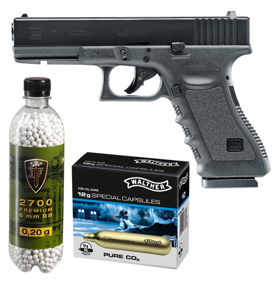 Set pistol airsoft Umarex Glock 17 + 10 capsule CO2 + flacon 2700 buc bile 0.20 g