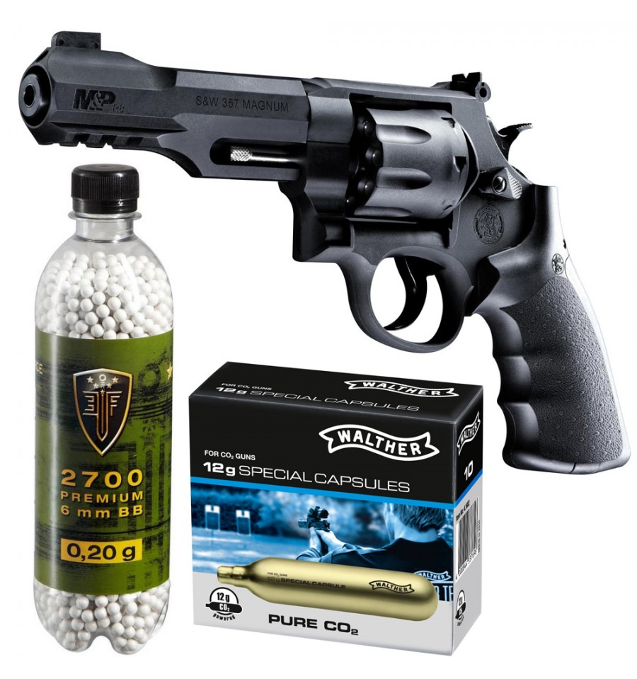Set revolver airsoft 1.6 jouli + 10 capsule CO2 + flacon 2700 buc bile 0.20 g, Umarex Smith & Wesson M&P R8