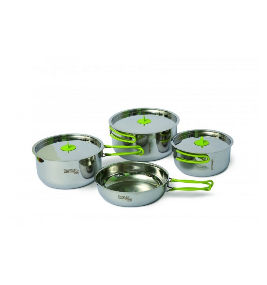 Set de vase inox pentru 2-3 persoane. Setul contine 1 oala de 1.5 l cu capac, o oala de 2.25 l cu capac, 1 oala de 3 l cu capac si o tigaie de 1.6 l.