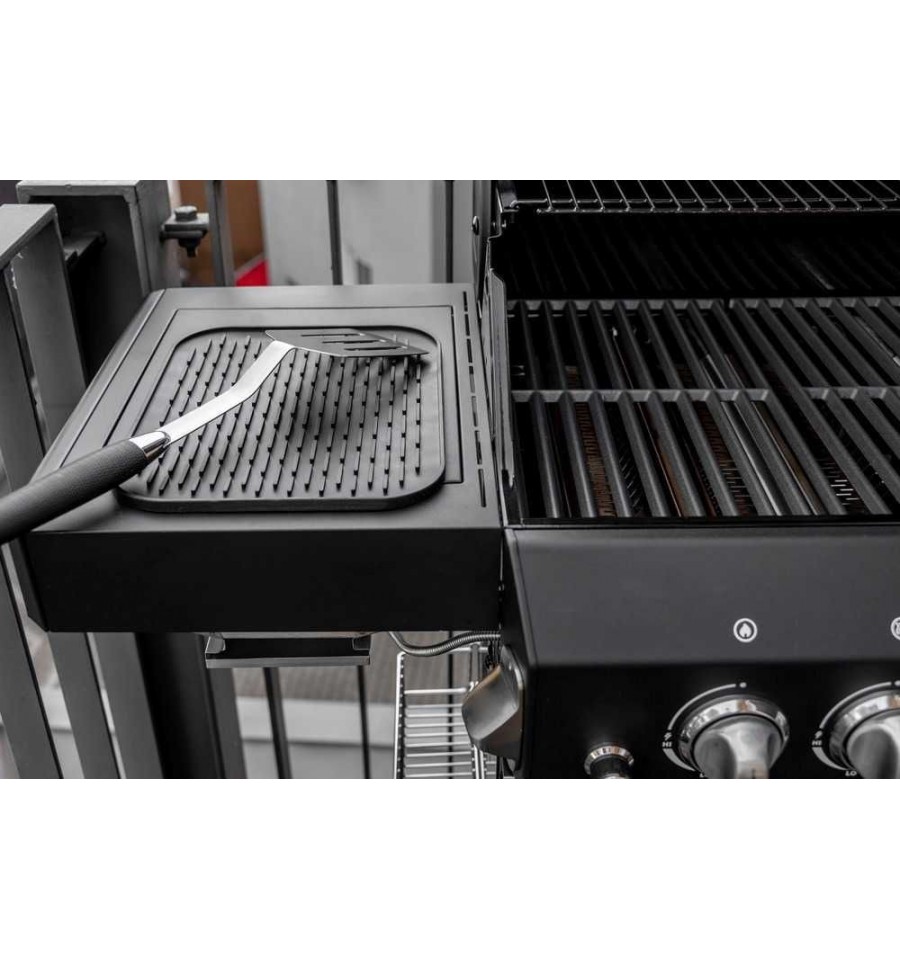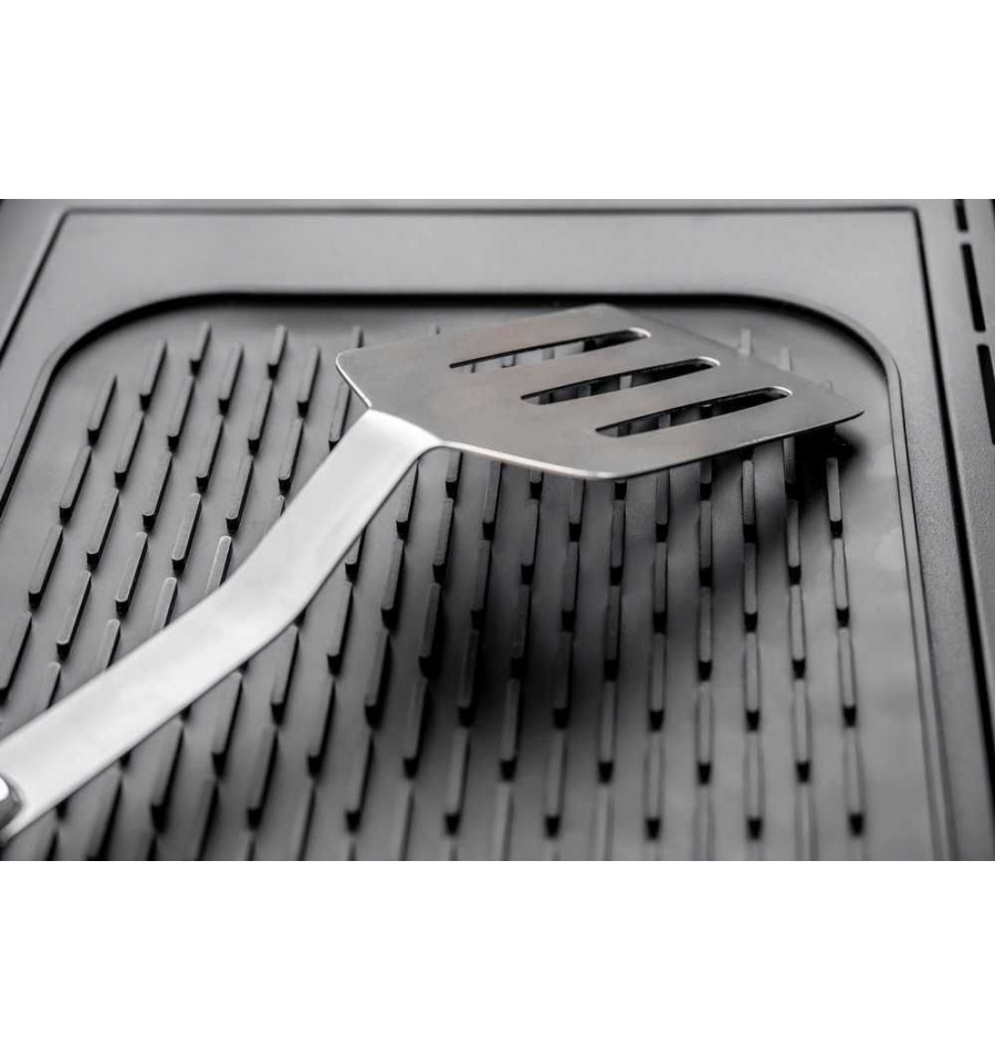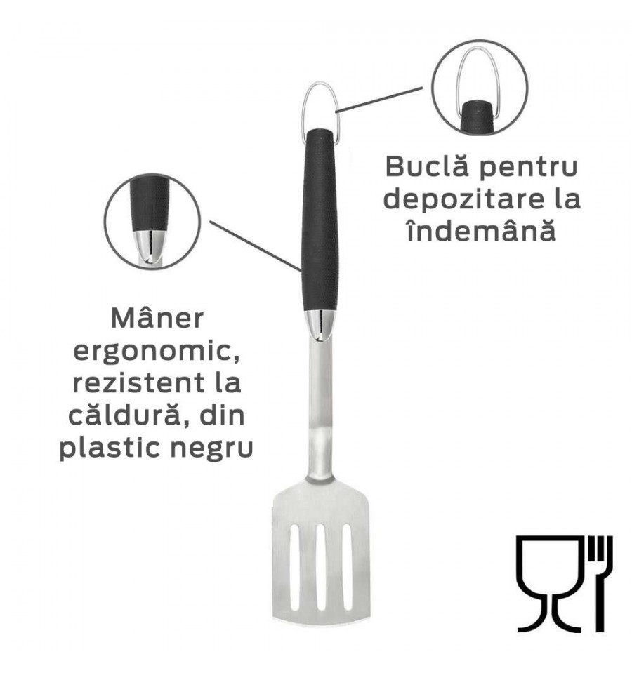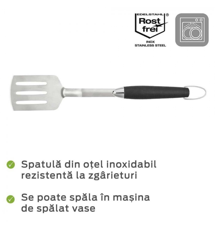 Spatula pentru gratar este fabricata din otel inoxidabil si pusa in valoare de un maner rezistent la caldura din plastic de culoare neagra. Aceasta combinatie de materiale robuste si culorile argintiu si negru transforma spatula pentru tigaie intr-un adevarat punct de atractie pe gratar. Este si foarte functionala si se poate spala in masina de spalat vase. Din punct de vedere functional, spatula din otel inoxidabil rezistenta la zgarieturi are, de asemenea, multe de oferit. De indata ce mancarea a fost prajita, ustensila de bucatarie poate fi curatata comod in masina de spalat vase. Manerul din plastic negru este ergonomic si, prin urmare, este deosebit de comod la manevrare. Bucla de la capatul manerului este ideala pentru a agata accesoriile de gatit pe un carlig, care face parte, de asemenea, din gama Kitchen Outdoor. In acest fel, aveti intotdeauna la indemana indispensabila spatula pentru gratar.