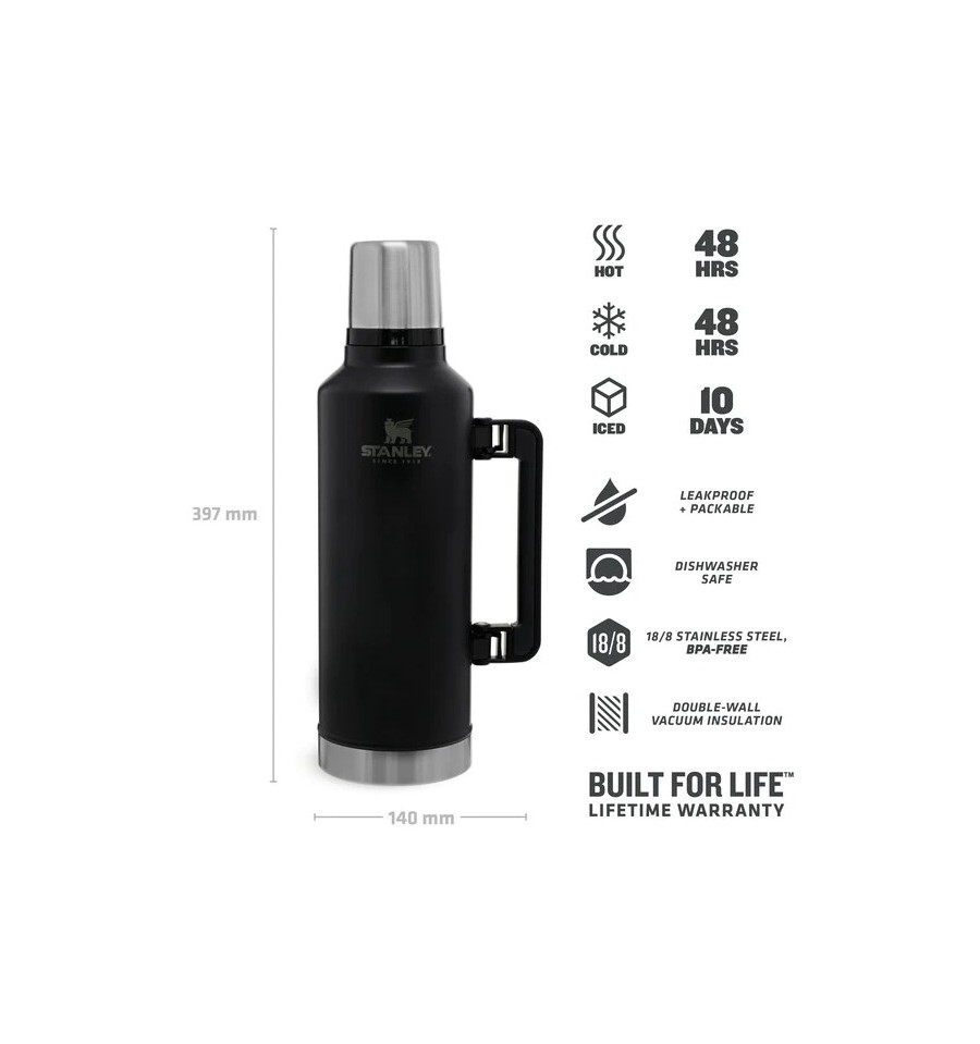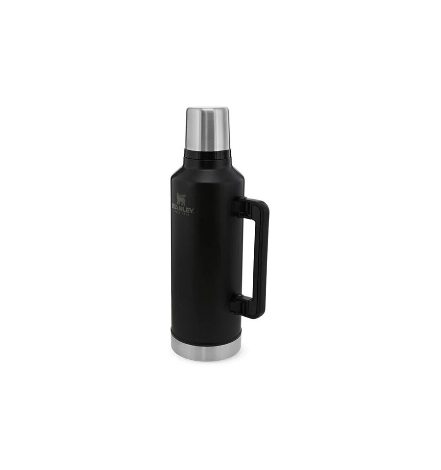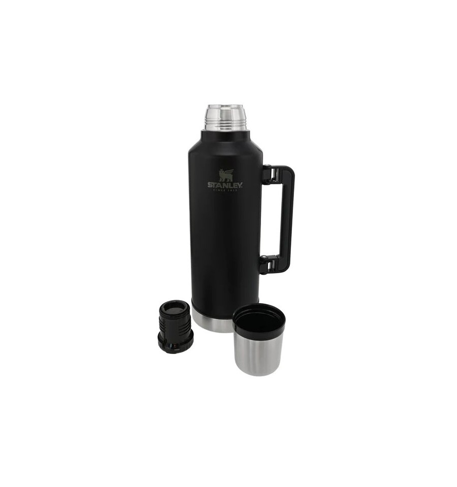 Termosul Stanley de 2.3 litri este robust, compact si dotat cu maner, astfel incat sa va puteti turna bautura fara sa o varsati, iar capacul, si el cu pereti dubli, poate fi folosit ca pahar.