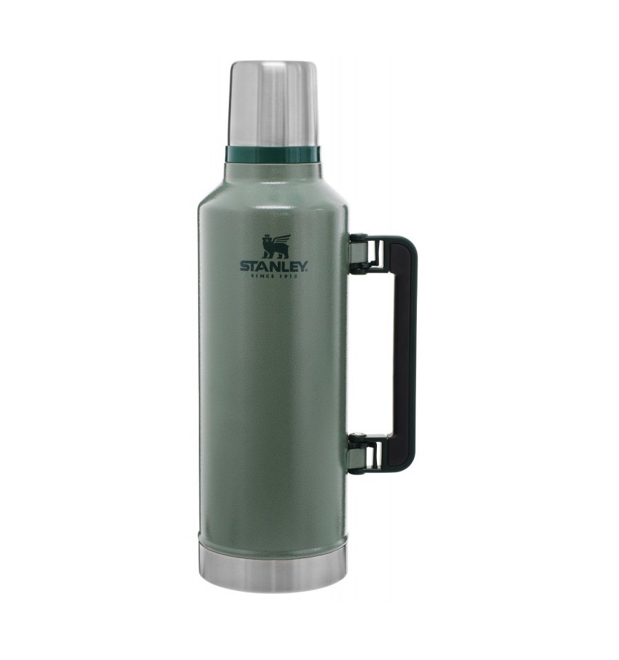 Termosul Stanley de 2.3 litri este robust, compact si dotat cu maner, astfel incat sa va puteti turna bautura fara sa o varsati, iar capacul, si el cu pereti dubli, poate fi folosit ca pahar.